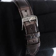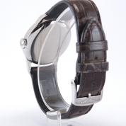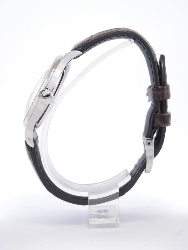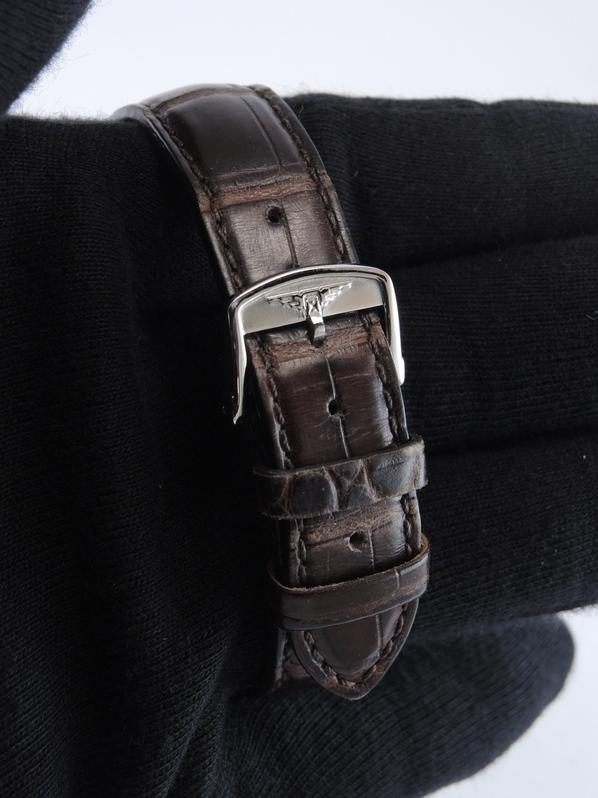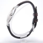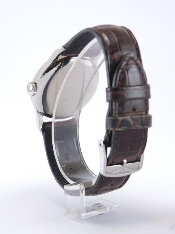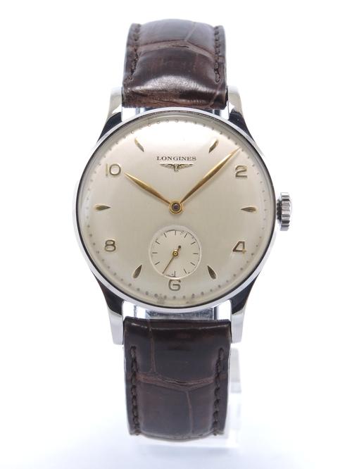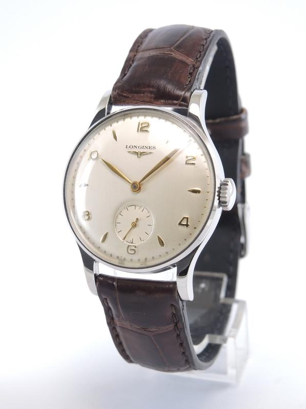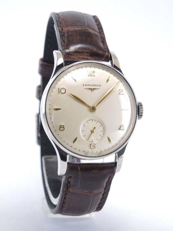 Steel case on leather strap, pin buckle, applied arabic numerals, gold leaf shaped hands, small second, plexiglass, hand wound movement, caliber 12.68Z.