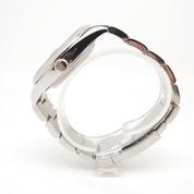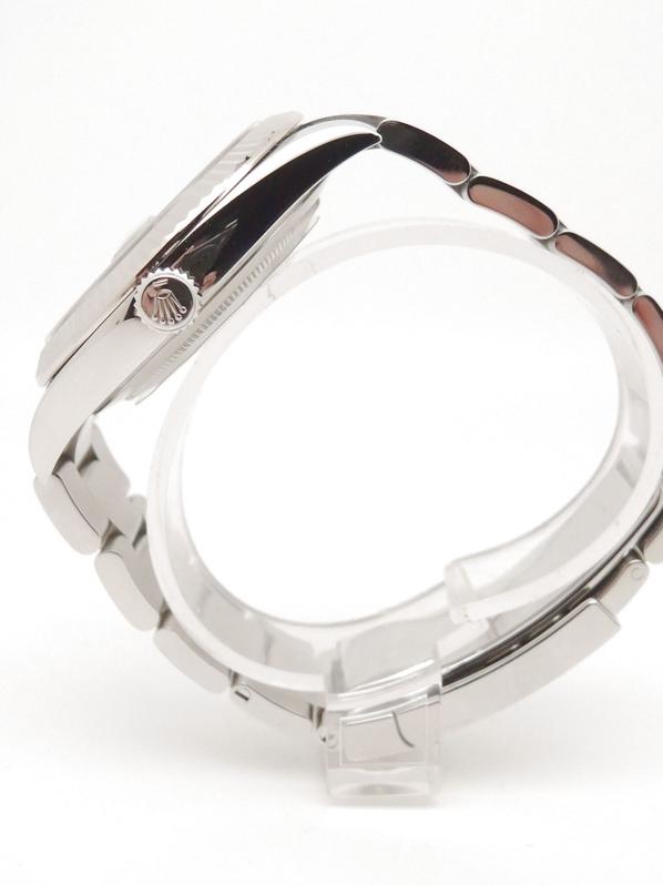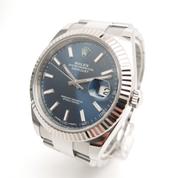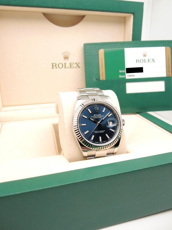 Full steel, oyster bracelet, blue sunburst dial, applied stick markers, date, sapphire glass, white gold fluted bezel, screw down crown, chronometer certified automatic movement (COSC). With original box and papers, full set!